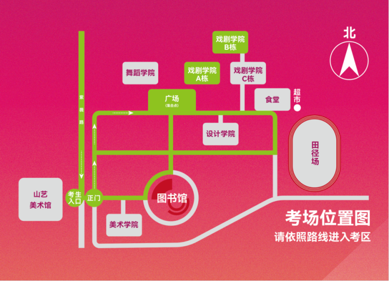2.地点:山东艺术学院长清校区戏剧学院楼(济南市长清区大学科技园紫薇路6000号)。考生须从山东艺术学院美术馆大门(山东艺术学院长清校区西门对面)进入,乘坐大巴直接前往考区,考点不再安排考生提前进校查看考场,考场示意图如下所示。